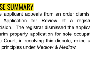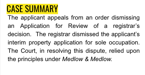 The applicant appeals from an order dismissing an Application for Review of a registrar’s decision. The registrar dismissed the applicant’s interim property application for sole occupation. The Court, in resolving this dispute, relied upon the principles under Medlow & Medlow.