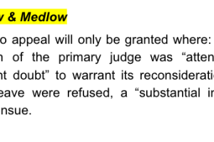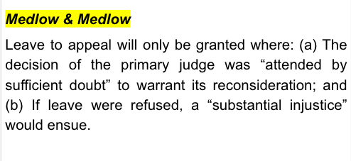 Medlow & Medlow (2016) FLC 93-692; [2016] FamCAFC 34 - provides that leave to appeal will only be granted where: (a) The decision of the primary judge was “attended by sufficient doubt” to warrant its reconsideration; and (b) If leave were refused, a “substantial injustice” would ensue.