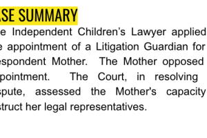 The Independent Children’s Lawyer applied for the appointment of a Litigation Guardian for the Respondent Mother. The Mother opposed the appointment. The Court, in resolving this dispute, assessed the Mother's capacity to instruct her legal representatives.