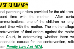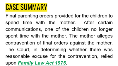 Final parenting orders provided for the children to spend time with the mother. After certain communications, one of the children no longer spent time with the mother. The mother alleges contravention of final orders against the father. The Court, in determining whether there was a reasonable excuse for the contravention, relied upon Family Law Act 1975.