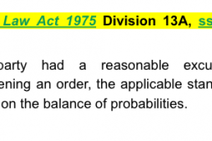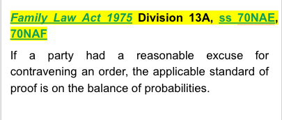 Family Law Act 1975 Division 13A, ss 70NAE, 70NAF - provides that if a party had a reasonable excuse for contravening an order, the applicable standard of proof is on the balance of probabilities.