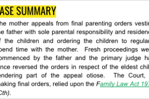 The mother appeals from final parenting orders vesting the father with sole parental responsibility and residence of the children and ordering the children to regularly spend time with the mother. Fresh proceedings were commenced by the father and the primary judge has since reversed the orders in respect of the eldest child, rendering part of the appeal otiose. The Court, in making final orders, relied upon the Family Law Act 1975 (Cth).