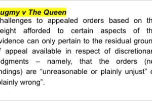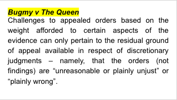 Bugmy v The Queen (2013) 249 CLR 571; [2013] HCA 37 - provides that challenges to appealed orders based on the weight afforded to certain aspects of the evidence can only pertain to the residual ground of appeal available in respect of discretionary judgments – namely, that the orders (not findings) are “unreasonable or plainly unjust” or “plainly wrong”.