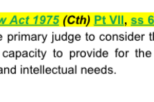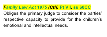 Family Law Act 1975 (Cth) Pt VII, ss 60CC - obliges the primary judge to consider the parties’ respective capacity to provide for the children’s emotional and intellectual needs.