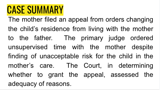 The mother filed an appeal from orders changing the child’s residence from living with the mother to the father. The primary judge ordered unsupervised time with the mother despite finding of unacceptable risk for the child in the mother’s care. The Court, in determining whether to grant the appeal, assessed the adequacy of reasons.