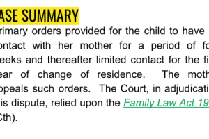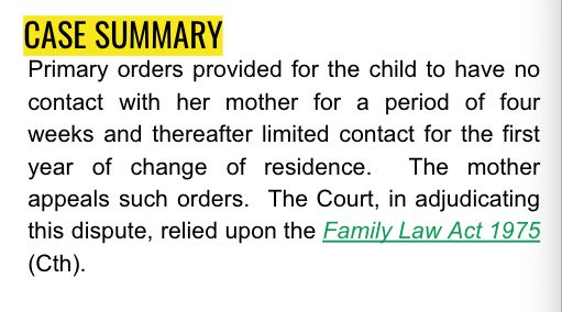 Primary orders provided for the child to have no contact with her mother for a period of four weeks and thereafter limited contact for the first year of change of residence. The mother appeals such orders. The Court, in adjudicating this dispute, relied upon the Family Law Act 1975 (Cth).