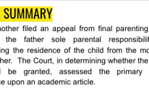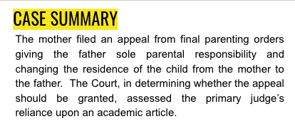 The mother filed an appeal from final parenting orders giving the father sole parental responsibility and changing the residence of the child from the mother to the father. The Court, in determining whether the appeal should be granted, assessed the primary judge’s reliance upon an academic article.