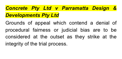 Concrete Pty Ltd v Parramatta Design & Developments Pty Ltd (2006) 229 CLR 577; [2006] HCA 55 - provides that grounds of appeal which contend a denial of procedural fairness or judicial bias are to be considered at the outset as they strike at the integrity of the trial process.