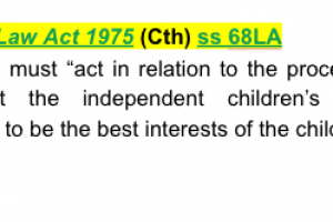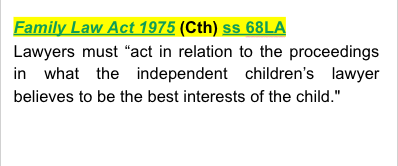 Family Law Act 1975 (Cth) ss 68LA - provides that lawyers must “act in relation to the proceedings in what the independent children’s lawyer believes to be the best interests of the child."