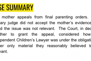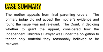 The mother appeals from final parenting orders. The primary judge did not accept the mother’s evidence and found the issue was not relevant. The Court, in deciding whether to grant the appeal, considered how the Independent Children’s Lawyer was under the obligation to tender only material they reasonably believed to be relevant.