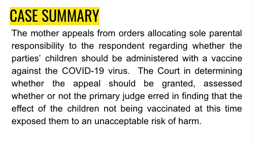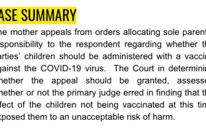 The mother appeals from orders allocating sole parental responsibility to thehusband regarding whether the parties’ children should be administered with a vaccine against the COVID-19 virus. The Court in determining whether the appeal should be granted, assessed whether or not the primary judge erred in finding that the effect of the children not being vaccinated at this time exposed them to an unacceptable risk of harm.
