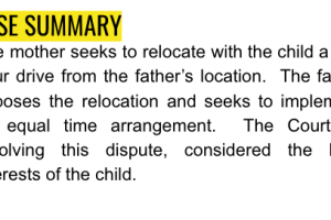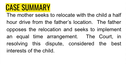 The mother seeks to relocate with the child a half hour drive from the father’s location. The father opposes the relocation and seeks to implement an equal time arrangement. The Court, in resolving this dispute, considered the best interests of the child.