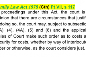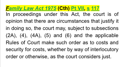 Family Law Act 1975 (Cth) Pt VII, s 117 - provides that in proceedings under this Act, the court is of opinion that there are circumstances that justify it in doing so, the court may, subject to subsections (2A), (4), (4A), (5) and (6) and the applicable Rules of Court make such order as to costs and security for costs, whether by way of interlocutory order or otherwise, as the court considers just.