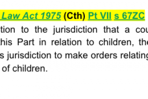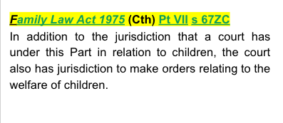 Family Law Act 1975 (Cth) Pt VII s 67ZC - provides that in addition to the jurisdiction that a court has under this Part in relation to children, the court also has jurisdiction to make orders relating to the welfare of children.