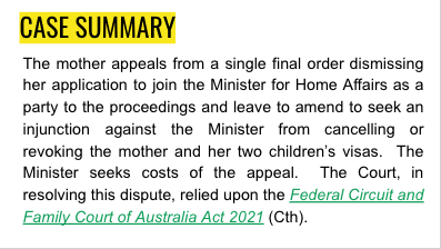 The mother now appeals from a single final order dismissing her application to join the Minister for Home Affairs as a party to the proceedings and leave to amend to seek an injunction against the Minister from cancelling or revoking the mother and her two children’s visas. The Minister seeks costs of the appeal. The Court, in resolving this dispute, relied upon the Federal Circuit and Family Court of Australia Act 2021 (Cth).