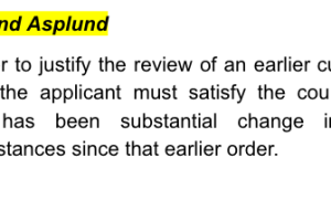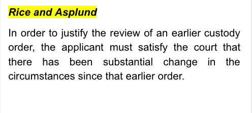 Rice and Asplund (1979) FLC 90-725; [1978] FamCA 84 - provides that in order to justify the review of an earlier custody order, the applicant must satisfy the court that there has been substantial change in the circumstances since that earlier order.