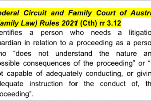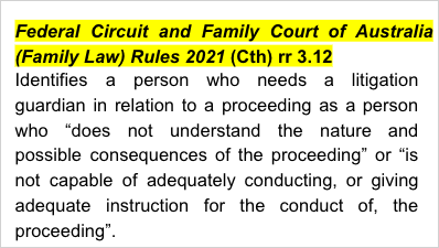 Federal Circuit and Family Court of Australia (Family Law) Rules 2021 (Cth) rr 3.12 - identifies a person who needs a litigation guardian in relation to a proceeding as a person who “does not understand the nature and possible consequences of the proceeding” or “is not capable of adequately conducting, or giving adequate instruction for the conduct of, the proceeding”.