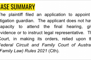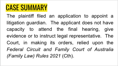 The plaintiff filed an application to appoint a litigation guardian. The applicant does not have capacity to attend the final hearing, give evidence or to instruct legal representative. The Court, in making its orders, relied upon the Federal Circuit and Family Court of Australia (Family Law) Rules 2021 (Cth).