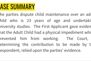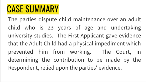 The parties dispute child maintenance over an adult child who is 23 years of age and undertaking university studies. The wife gave evidence that the Adult Child had a physical impediment that prevented him from working. The Court, in determining the contribution to be made by the husband, relied upon the parties' evidence.