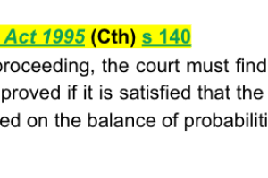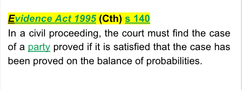 Evidence Act 1995 (Cth) s 140 - provides that in a civil proceeding, the court must find the case of a party proved if it is satisfied that the case has been proved on the balance of probabilities.
