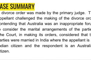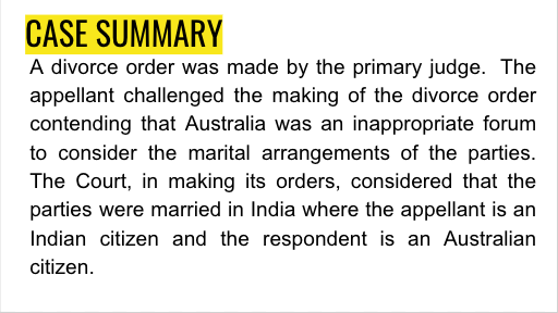 A divorce order was made by the primary judge. The appellant challenged the making of the divorce order contending that Australia was an inappropriate forum to consider the marital arrangements of the parties. The Court, in making its orders, considered that the parties were married in India where the appellant is an Indian citizen and the respondent is an Australian citizen.
