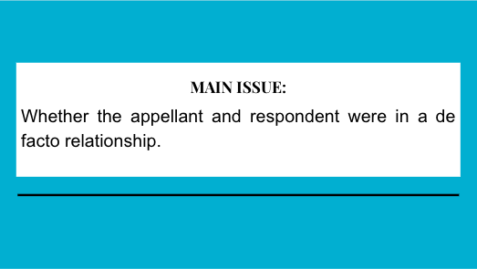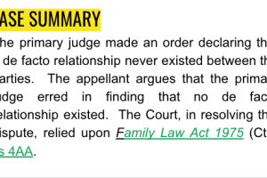 The appellant sought a declaration that a de facto relationship existed between the respondent and herself from 2007–2017. The respondent sought a declaration that a de facto relationship never existed between the parties. He conceded that whilst he and the appellant had a casual sexual relationship for about two years from when they met in 2004, and a spasmodic sexual relationship over a succeeding period of about three years, as well as maintaining a working relationship and friendship simultaneously and thereafter, nonetheless the nature of their relationship was not a de facto relationship as defined in the Act. The primary judge accepted the respondent’s arguments.