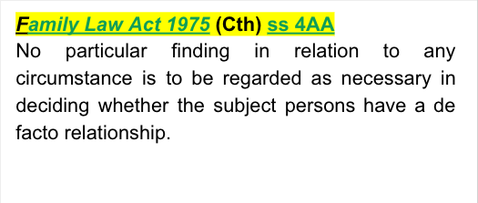 Family Law Act 1975 (Cth) ss 4AA - highlights that no particular finding in relation to any circumstance is to be regarded as necessary in deciding whether the subject persons have a de facto relationship.
