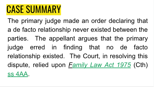 The primary judge made an order declaring that a de facto relationship never existed between the parties. The appellant argues that the primary judge erred in finding that no de facto relationship existed. The Court, in resolving this dispute, relied upon Family Law Act 1975 (Cth) ss 4AA.