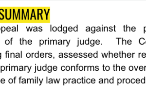 On 1 September 2022 the Court allowed in part an appeal against property orders. The property orders provided that two real properties (one in City E and one in City C) be sold, and the net sale proceeds be divided 54 per cent to the father and 46 per cent to the mother. However, in the event the mother did not relocate to Country D, the sale proceeds of the City C property were to be divided so as to achieve an overall division of property 57/43 per cent in the mother’s favour. In broad terms, otherwise the parties kept the property and financial resources in their own respective names.