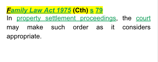 Family Law Act 1975 (Cth) s 79 - provides that in property settlement proceedings, the court may make such order as it considers appropriate.