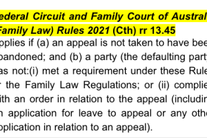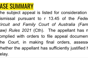 The appeal is listed for consideration of dismissal pursuant to r 13.45 of the Federal Circuit and Family Court of Australia (Family Law) Rules 2021 (Cth). The appellant has not complied with orders to file appeal documents. The Court, in making final orders, assessed whether the appellant has sufficiently justified his delay.