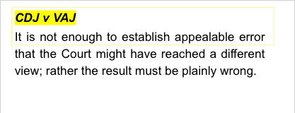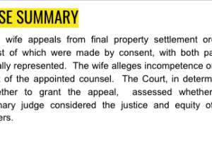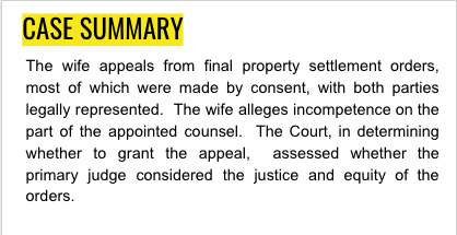 The wife appeals from final property settlement orders, most of which were made by consent, with both parties legally represented. The wife alleges incompetence on the part of the appointed counsel. The Court, in determining whether to grant the appeal, assessed whether the primary judge considered the justice and equity of the orders.