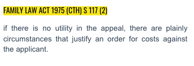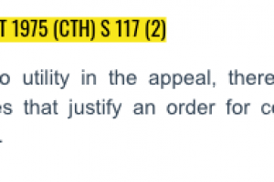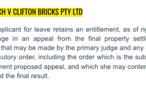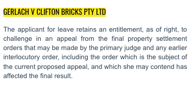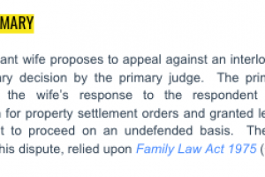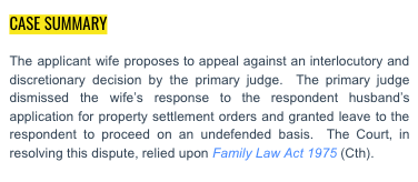 The applicant wife proposes to appeal against an interlocutory and discretionary decision by the primary judge. The primary judge dismissed the wife’s response to the respondent husband’s application for property settlement orders and granted leave to the respondent to proceed on an undefended basis. The Court, in resolving this dispute, relied upon FamilyLaw Act 1975 (Cth).