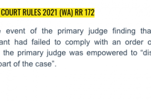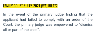 The primary judge dismissed the wife’s response to the respondent husband’s application for property settlement orders and granted leave to the respondent to proceed on an undefended basis. The orders which are the subject of the proposed appeal were made pursuant to r 172 of the Family Court Rules 2021 (WA) (“the rules”). The primary judge determined that such orders were necessary and appropriate having regard to the history of the proceedings, including the length of delay, the inadequacy of adequate explanation provided by the applicant for that delay and multiple instances of the applicant’s failure to comply with case management orders up to and including the hearing on 26 November 2021.