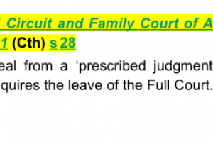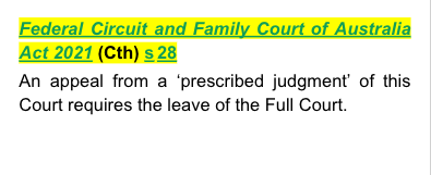 Federal Circuit and Family Court of Australia Act 2021 (Cth) s 28 - provides that an appeal from a ‘prescribed judgment’ of this Court requires the leave of the Full Court.