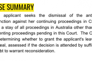 The applicant seeks the dismissal of the anti-suit injunction against her continuing proceedings in China, and a stay of all proceedings in Australia other than the parenting proceedings pending in this Court. The Court, in determining whether to grant the applicant's leave to appeal, assessed if the decision is attended by sufficient doubt to warrant reconsideration.