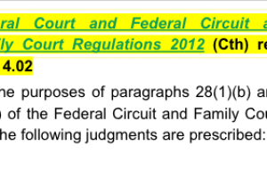 Federal Court and Federal Circuit and Family Court Regulations 2012 (Cth) regs 1.03, 4.02 - provides that for the purposes of paragraphs 28(1)(b) and (3)(e) of the Federal Circuit and Family Court Act, the following judgments are prescribed: (a) an interlocutory decree (other than a decree in relation to a child welfare matter).