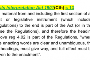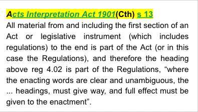 Acts Interpretation Act 1901(Cth) s 13 - provides that all material from and including the first section of an Act or legislative instrument (which includes regulations) to the end is part of the Act (or in this case the Regulations), and therefore the heading above reg 4.02 is part of the Regulations, “where the enacting words are clear and unambiguous, the ... headings, must give way, and full effect must be given to the enactment”.