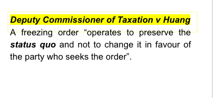 The purpose of a freezing order is to maintain the status quo and not to improve the security position of the applicant or to render the respondent liable for imprisonment for debt. The order should only have been considered if it was clear that it could be complied with, for example, where the transferred funds were in an account under the wife’s control.
