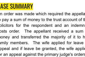An order was made which required the wife to pay a sum of money to the trust account of the solicitors for the respondent and an indemnity costs order. The wife received a sum of money and transferred the majority of it to her family members. The wife applied for leave to appeal and if leave be granted, the wife applied for an appeal against the primary judge's orders.
