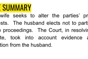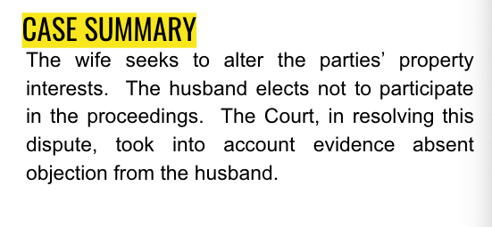 The wife seeks to alter the parties’ property interests. The husband elects not to participate in the proceedings. The Court, in resolving this dispute, took into account evidence absent objection from the husband.