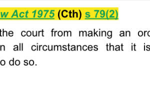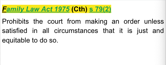 Family Law Act 1975 (Cth) s 79(2) - prohibits the court from making an order unless satisfied in all circumstances that it is just and equitable to do so.