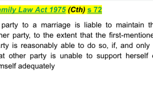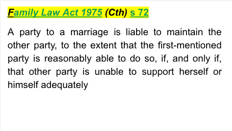 Family Law Act 1975 (Cth) s 72 - provides that a party to a marriage is liable to maintain the other party, to the extent that the first-mentioned party is reasonably able to do so, if, and only if, that other party is unable to support herself or himself adequately.