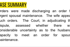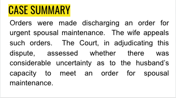 Orders were made discharging an order for urgent spousal maintenance. The wife appeals to such orders. The Court, in adjudicating this dispute, assessed whether there was considerable uncertainty as to the husband’s capacity to meet an order for spousal maintenance.